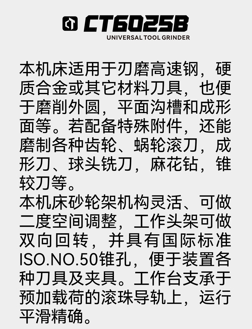 • 商品名称:呲铁CT6025B高精密磨床工具磨平面磨外圆磨内圆磨床铣刀磨床