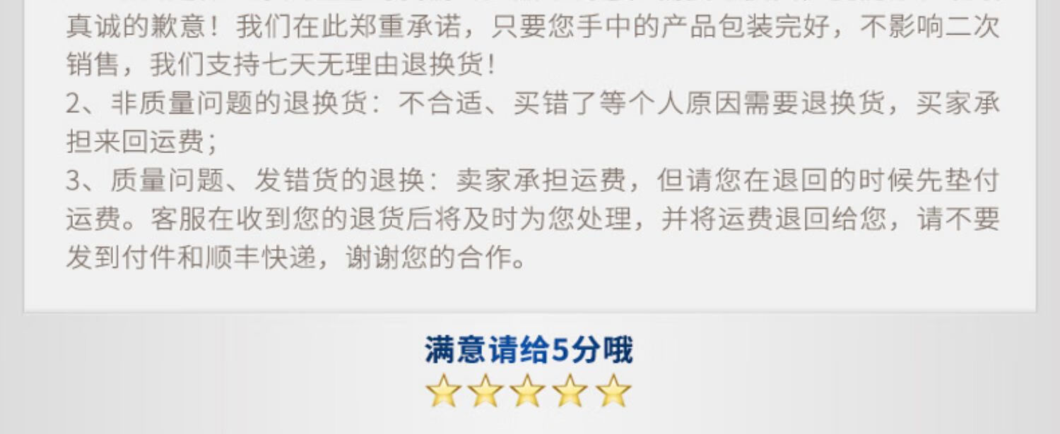 换货处理周期:自接收到问题商品之日起 15 日之内为您处理完成;